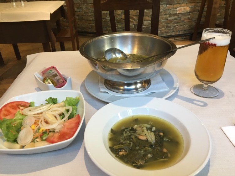 My dinner: salad, Caldo Gallego (Gallician soup), and a Cerveza.