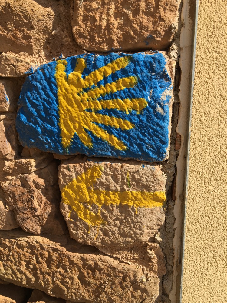 The route is well marked, with the sign of the shell, indicating that all roads lead to Santiago–although sometimes they reverse the shell so you’re unsure which direction the mean. They also use a yellow arrow, or stones. Here are some examples: