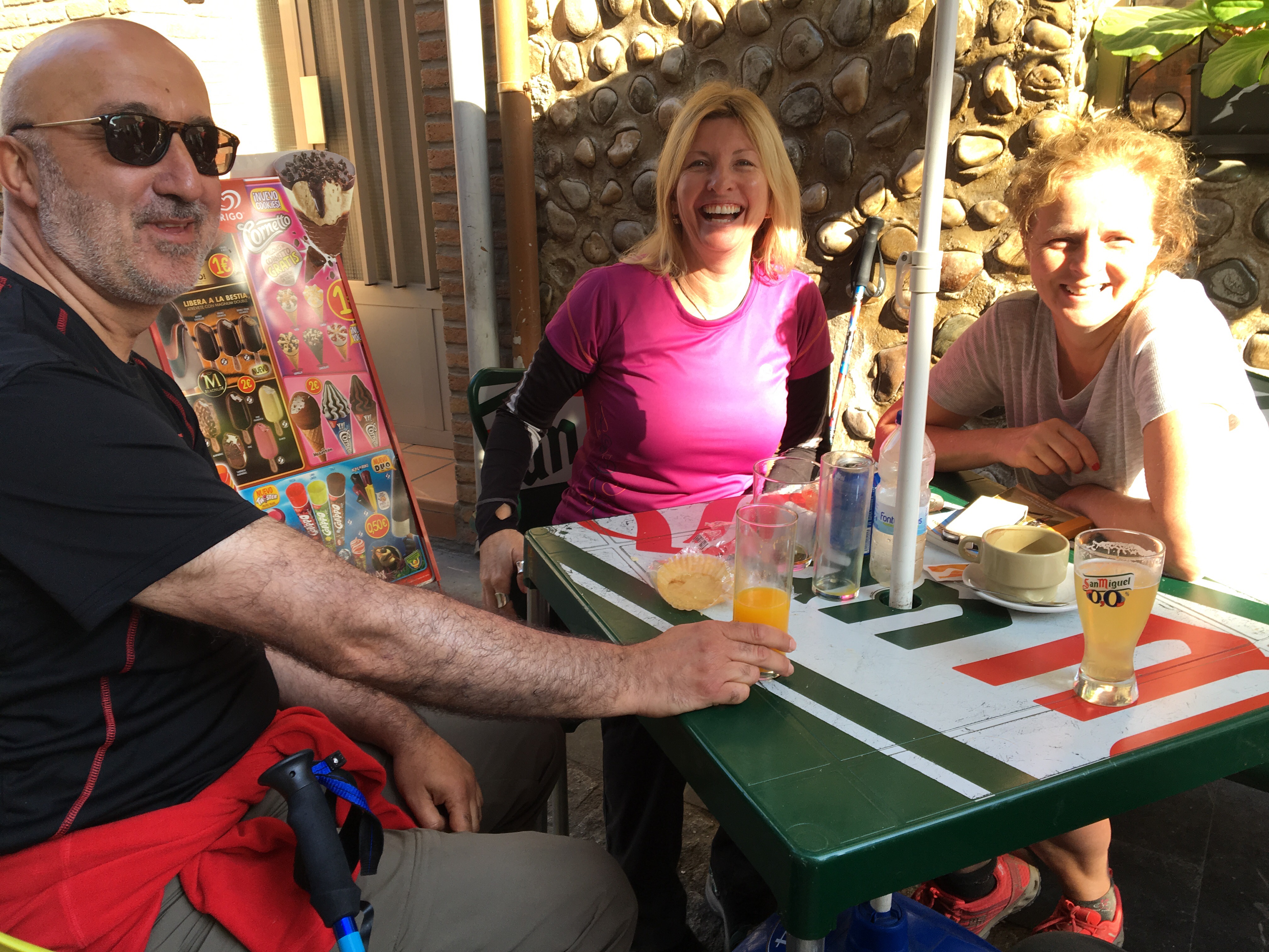 At a village bar: a Spainard, an Aussie and an Irish lassie. The Camino is a melting pot!